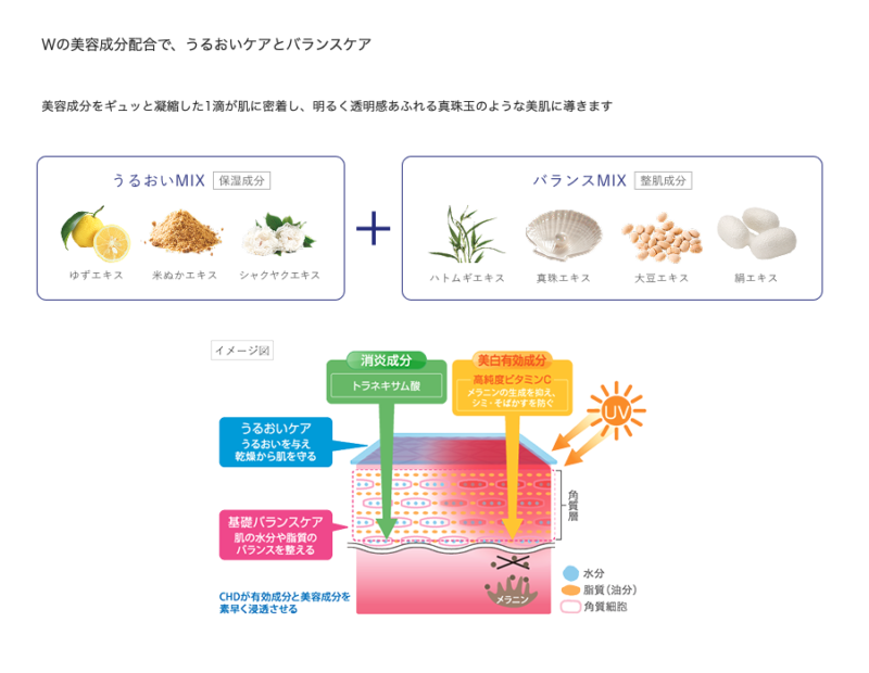 注目は「高純度ビタミンC誘導体」と「トラネキサム酸」の2大美白有効成分。シミ・くすみ予防に加え、年齢サイン・炎症・肌ダメージまで幅広くケアします。